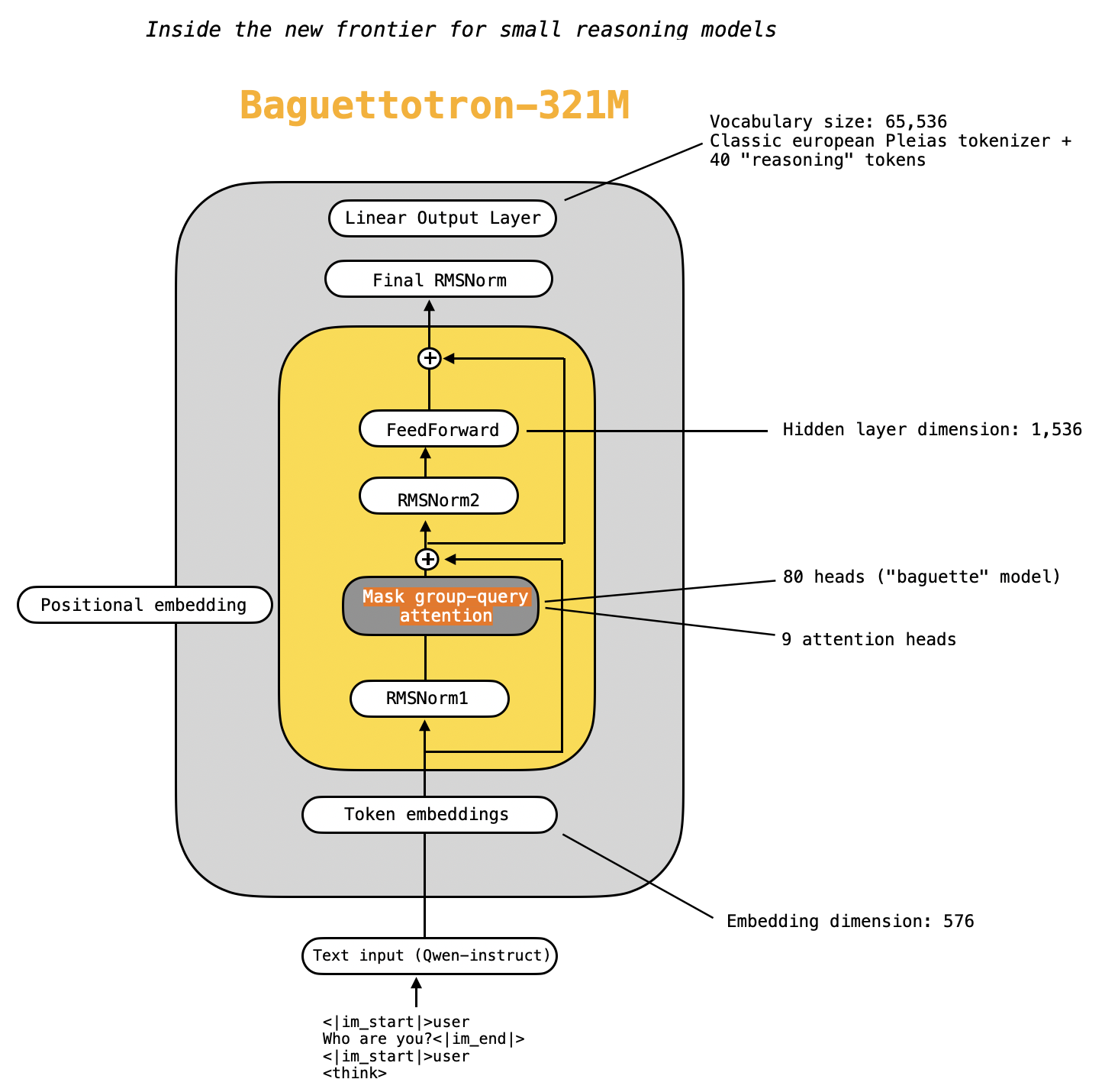 Baguettotron is a 321M parameters decoders with a standard Qwen/Llama-like design, except for extreme depth with 80 layers (a type of model we internally nicknamed "baguette")