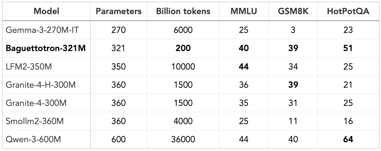 The name is both a nod to French origins and to the unusual shape of the model: with 80 layers, Baguettotron is currently the deepest SLM in its size range.
