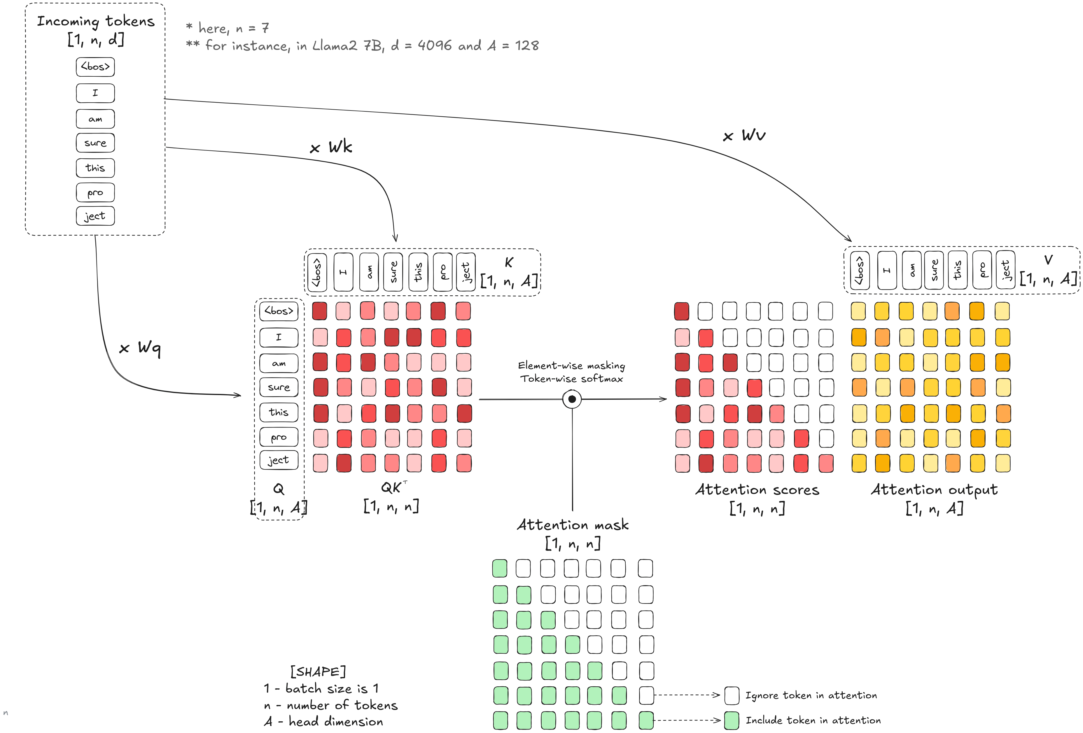 Why this matters: In continuous batching, , , and can have different numbers of tokens because, as we'll see, we'll be processing different stages (prefill and decode) at the same time. To make it more general, let's say has shape , has shape , and has shape .