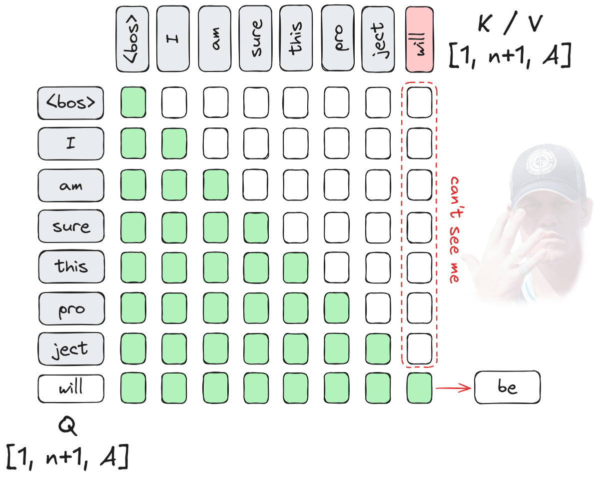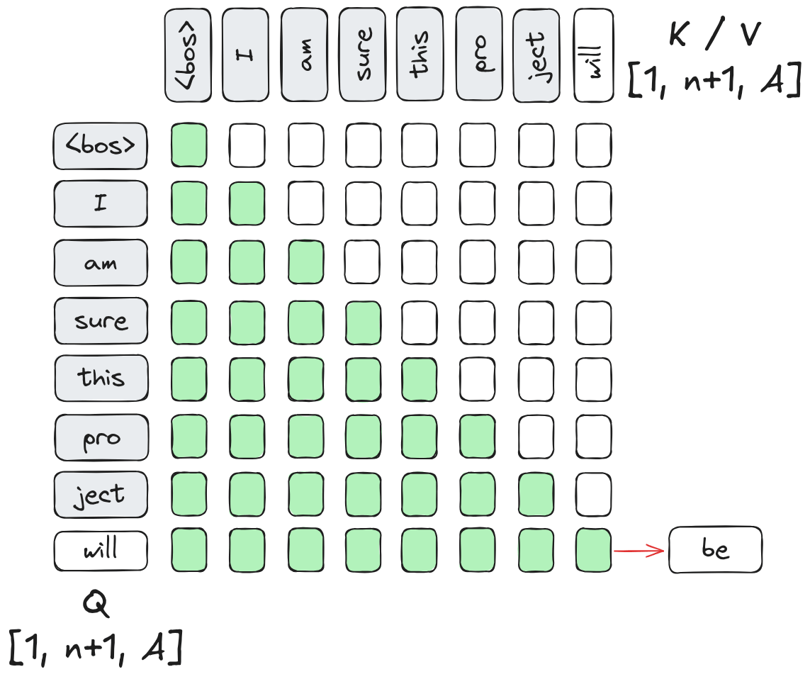 To compute the attention scores of the new token, we still need the key and value projections of the previous tokens. So we need to repeat the matrix multiplication of the old tokens (in grey in the figure above) with and to retrieve a result that was already computed once before. In other terms, we are wasting compute. Let's see how we can avoid that.