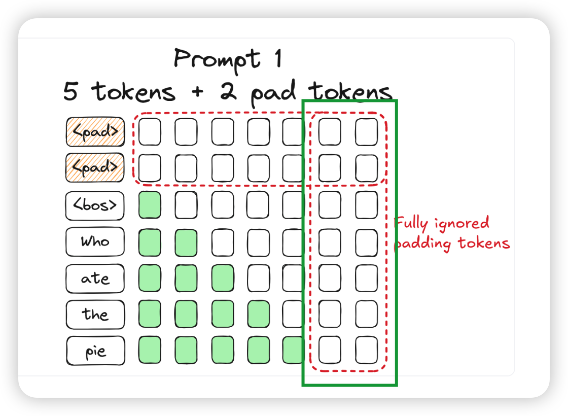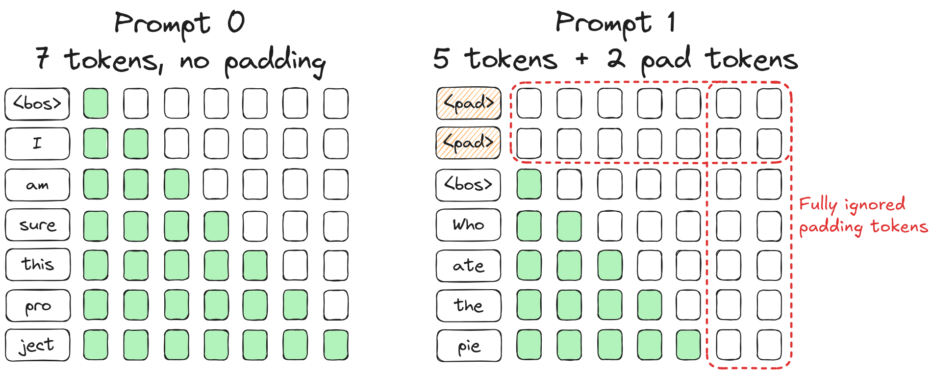 To batch prompts together, the naive way is to add an axis to both input tensors: token sequence and attention mask. However, this comes with a constraint on the shape of the inputs: we need all prompts to have the same length, because tensors must be rectangular. To achieve this, we usually add padding on the left so the new token prediction always comes from the rightmost token. We also modify the attention mask of each prompt accordingly, as shown below: