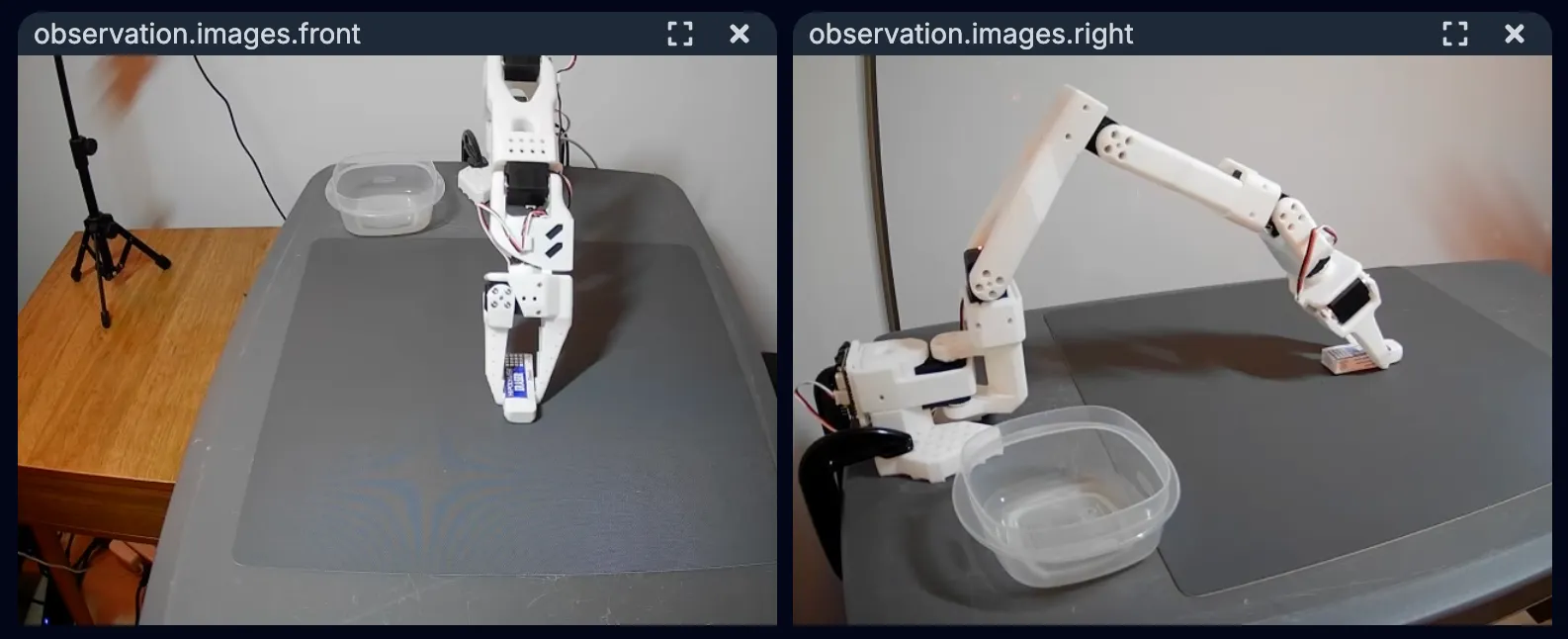 - See what the robot sees. When recording demonstrations, I only looked at the camera footage instead of the follower arm. A slight improvement: for some reason, rerun would randomly hide some topic stream even when they exist, so I ended up coding up my own OpenCV visualization of the two cameras’ footage.