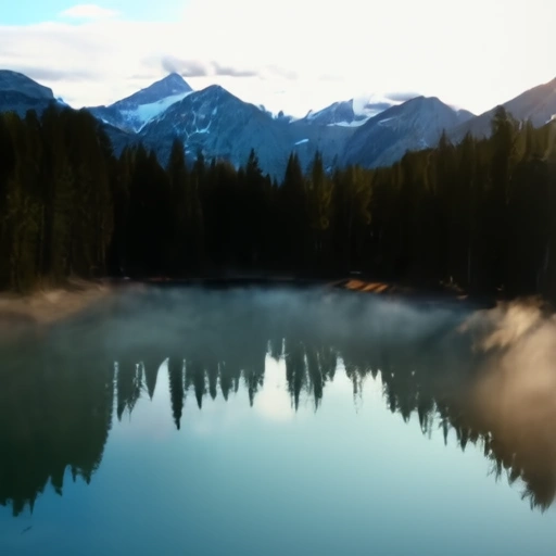 - A drone quickly rises through a bank of morning fog, revealing a pristine alpine lake surrounded by snow-capped mountains. The camera glides forward over the glassy water, capturing perfect reflections of the peaks. As it continues, the perspective shifts to reveal a lone wooden cabin with a curl of smoke from its chimney, nestled among tall pines at the lake's edge. The final shot tracks upward rapidly, transitioning from intimate to epic as the full mountain range comes into view, bathed in the golden light of sunrise breaking through scattered clouds.