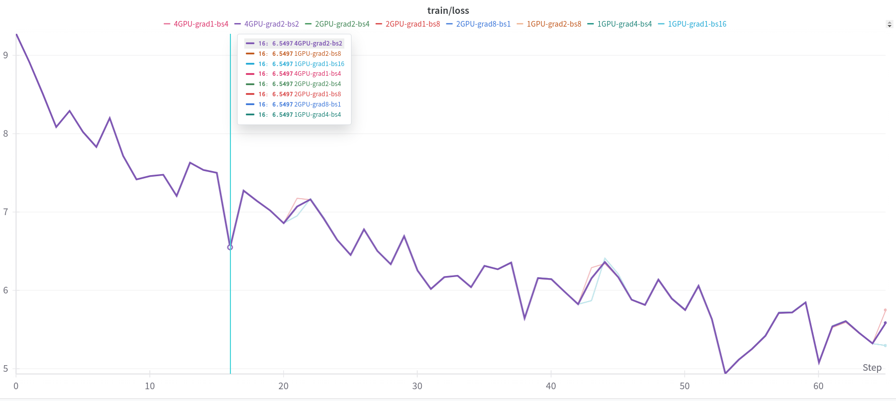Running it on several training configurations with constant global batch size equal to 32 gives the following graph: