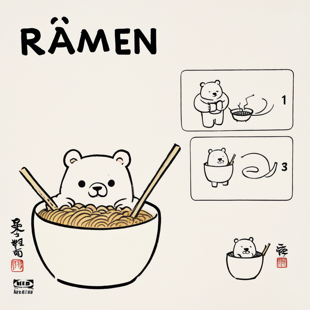 pipeline("A bowl of ramen shaped like a cute kawaii bear, by Feng Zikai", cross_attention_kwargs={"scale": 1.0}).images[0]