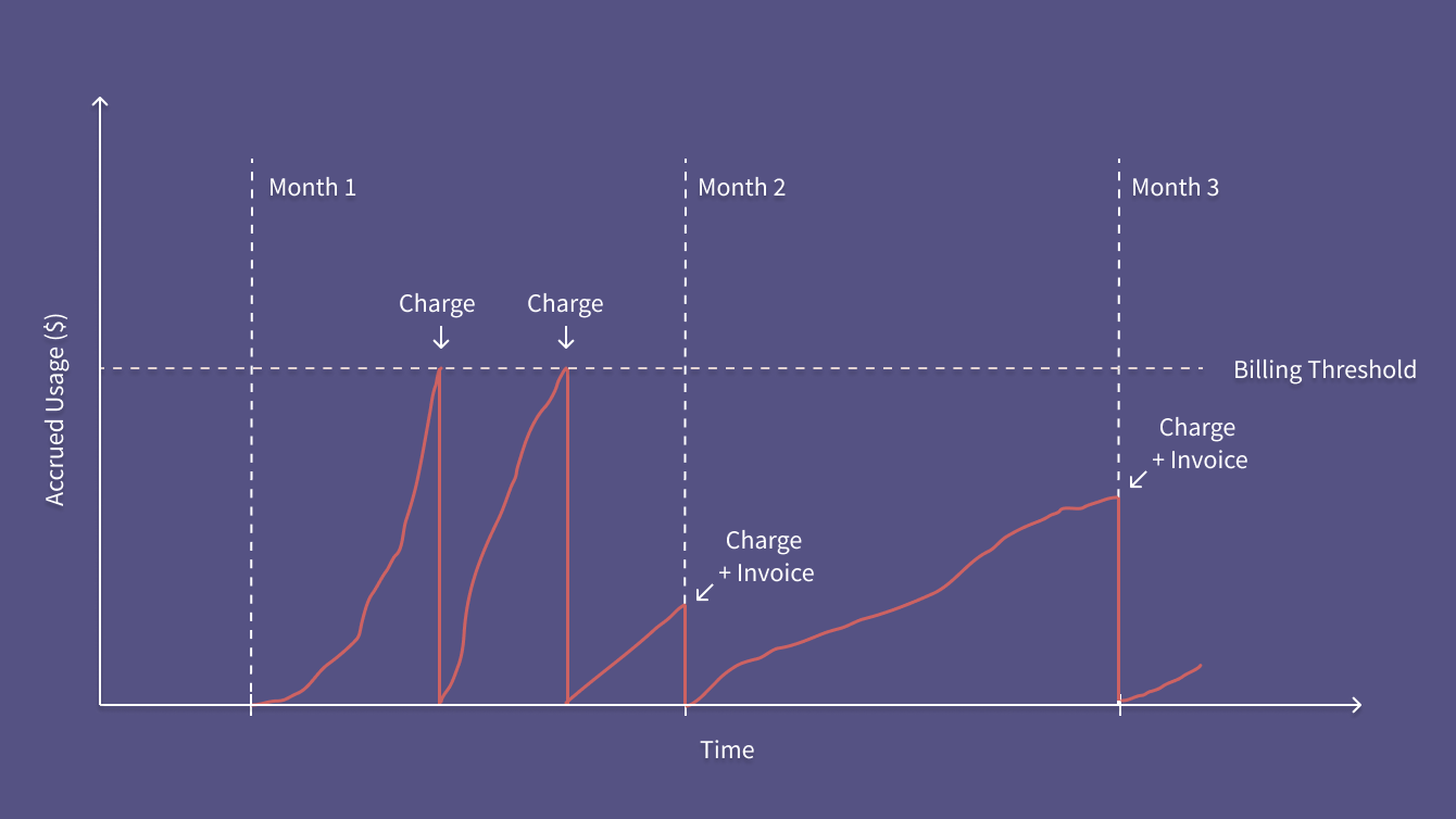 For example, if your billing threshold is set at $100.00, and you incur $254.00 of usage during a given month, your credit card will be charged a total of three times during the month: