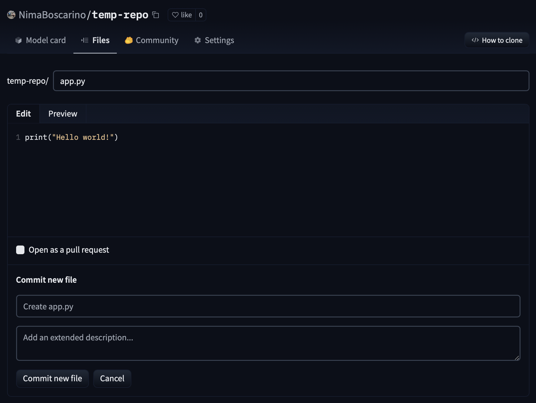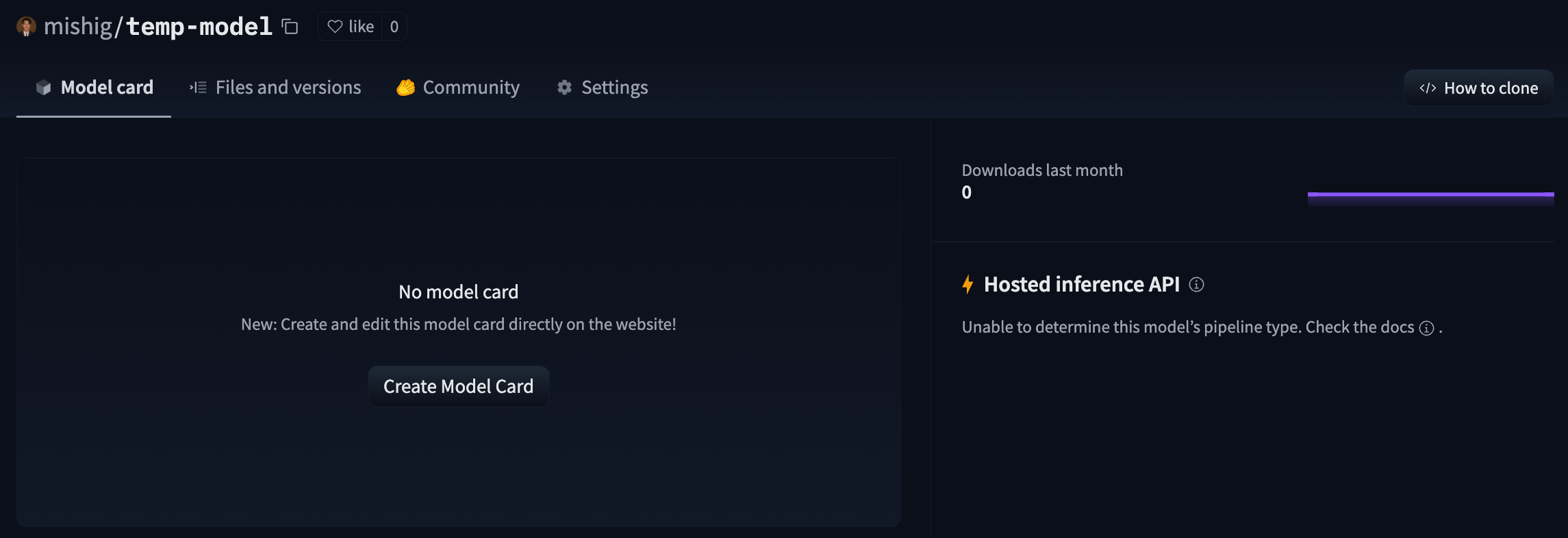 Note that the Hub prompts you to create a Model Card, which you can learn about in the Model Cards documentation. Including a Model Card in your model repo is best practice, but since we’re only making a test repo at the moment we can skip this.