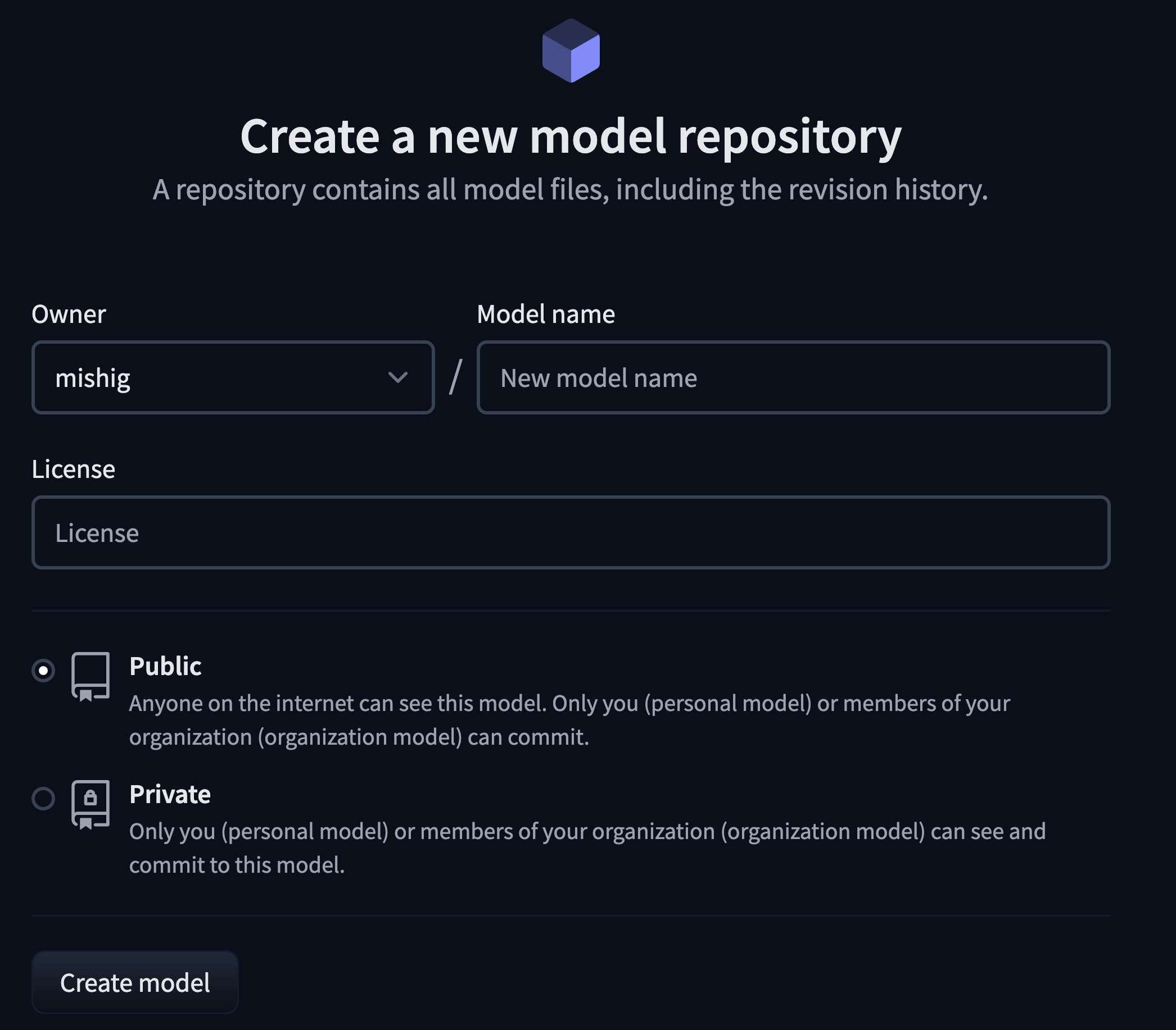 Enter your model’s name. This will also be the name of the repository.