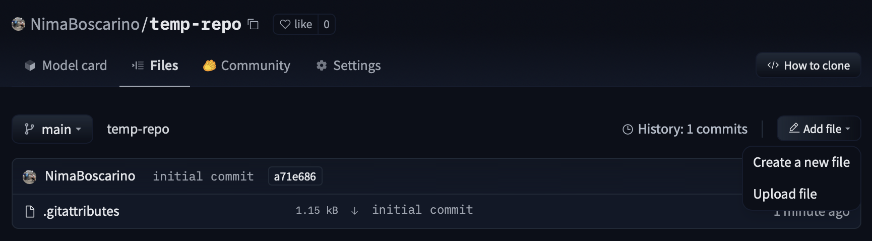 Every time you go through the add-commit-push cycle, the repo will keep track of every change you’ve made to your files. The UI allows you to explore the model files and commits and to see the difference (also known as diff) introduced by each commit. To see the history, you can click on the History: X commits link.