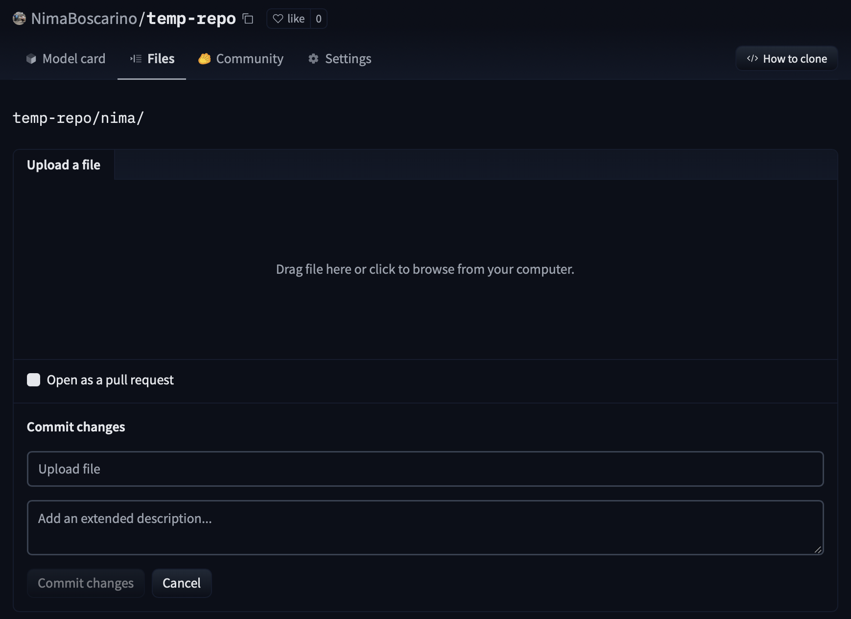 If you choose Upload file you’ll be able to choose a local file to upload, along with a message summarizing your changes to the repo.
