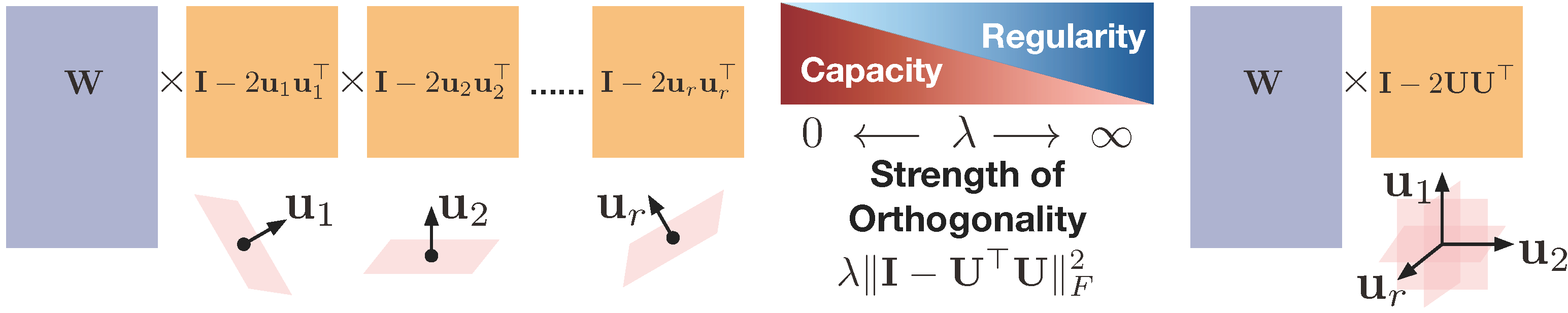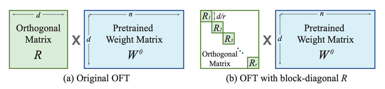 OFT preserves the hyperspherical energy by learning an orthogonal transformation for neurons to keep the cosine similarity between them unchanged. In practice, this means taking the matrix product of an orthogonal matrix with the pretrained weight matrix. However, to be parameter-efficient, the orthogonal matrix is represented as a block-diagonal matrix with rank r blocks. Whereas LoRA reduces the number of trainable parameters with low-rank structures, OFT reduces the number of trainable parameters with a sparse block-diagonal matrix structure.