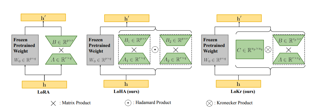 LoKr is very similar to LoRA and LoHa, and it is also mainly applied to diffusion models, though you could also use it with other model types. LoKr replaces the matrix product with the Kronecker product instead. The Kronecker product decomposition creates a block matrix which preserves the rank of the original weight matrix. Another benefit of the Kronecker product is that it can be vectorized by stacking the matrix columns. This can speed up the process because you’re avoiding fully reconstructing ∆W.