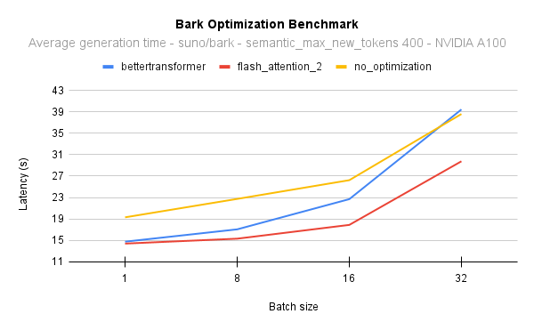 The following diagram shows the latency for the native attention implementation (no optimisation) against Flash Attention 2. In all cases, we generate 400 semantic tokens on a 40GB A100 GPU with PyTorch 2.1: