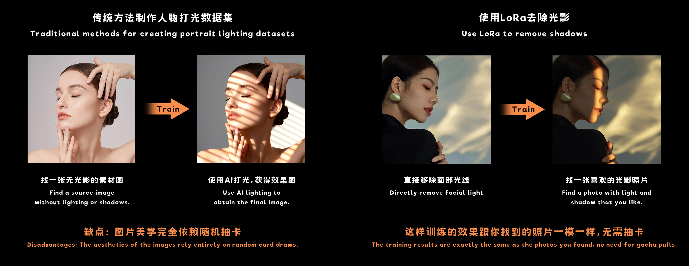 Let me preface this by saying that if you've ever trained a lighting LoRa dataset, you know how difficult it is to remove light from a person's face, but training requires a pair of images (one with lighting and one without).