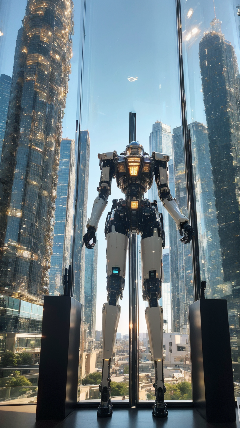 - best quality, mecha glass room, highrise, transparent, mecha interior, city background, realistic photography, fine details, 8k,