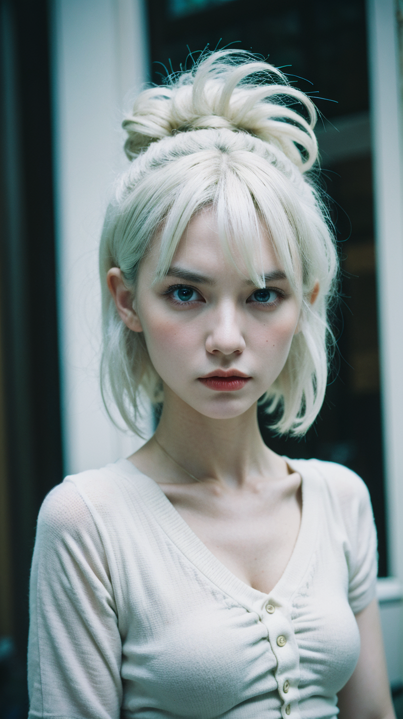 - an evil demonic woman, white hair, blue eyes, short messy hair, arrogant mood, analog photo