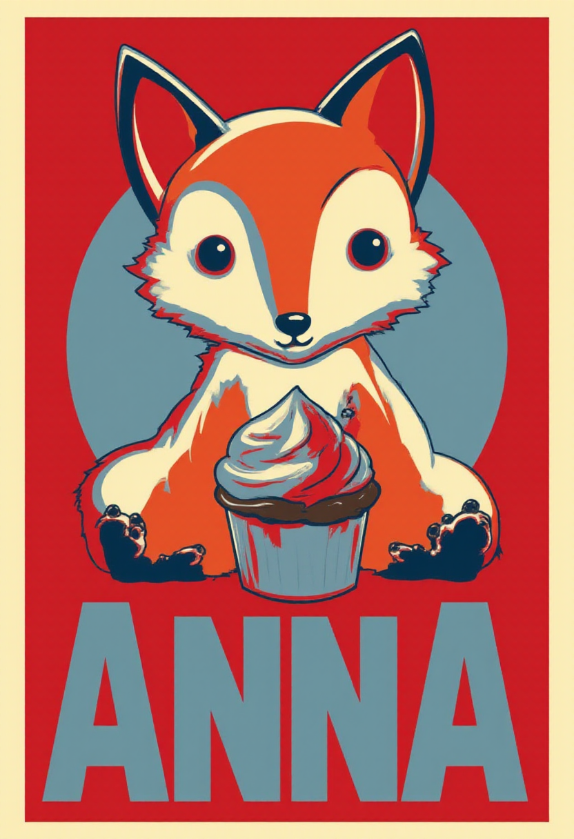 - red and blue vector style poster with a border, fox with cupcake, bottom of poster has bold blue text "Anna" <lora:Hope_Style_Poster__Flux:1>
