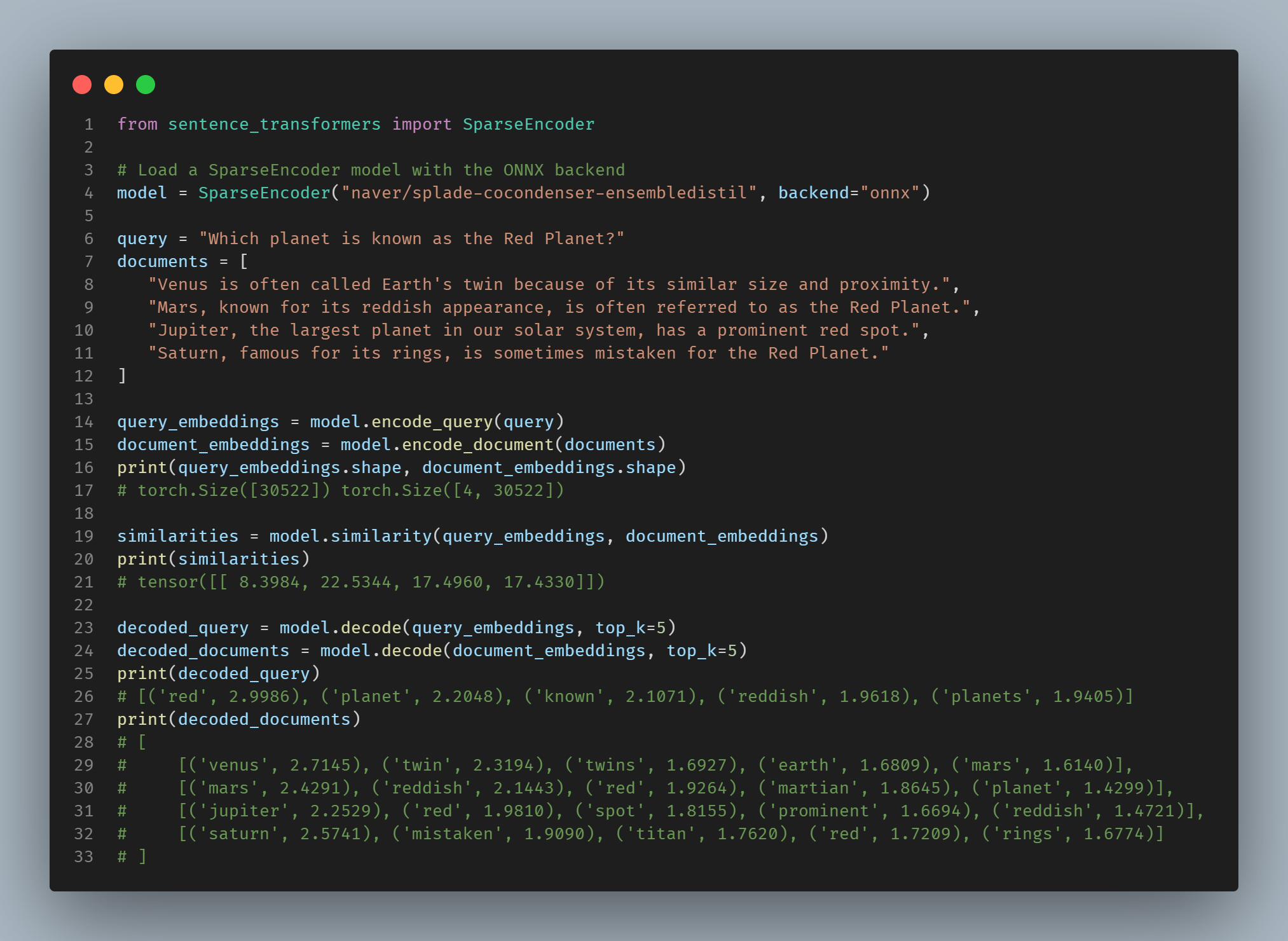 - Full SPLADE, Inference-free SPLADE, and CSR architecture support - 4 new modules, 12 new losses, 9 new evaluators - Integration with @elastic-co, @opensearch-project, @NAVER LABS Europe, @qdrant, @IBM, etc. - Decode interpretable embeddings to understand token importance - Hybrid search integration to get the best of both worlds