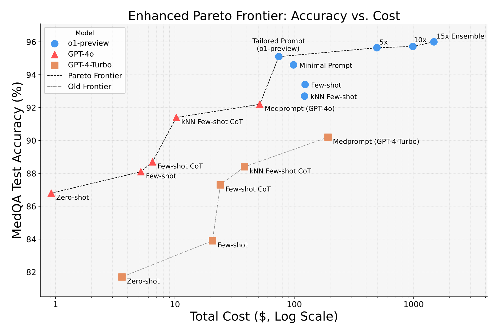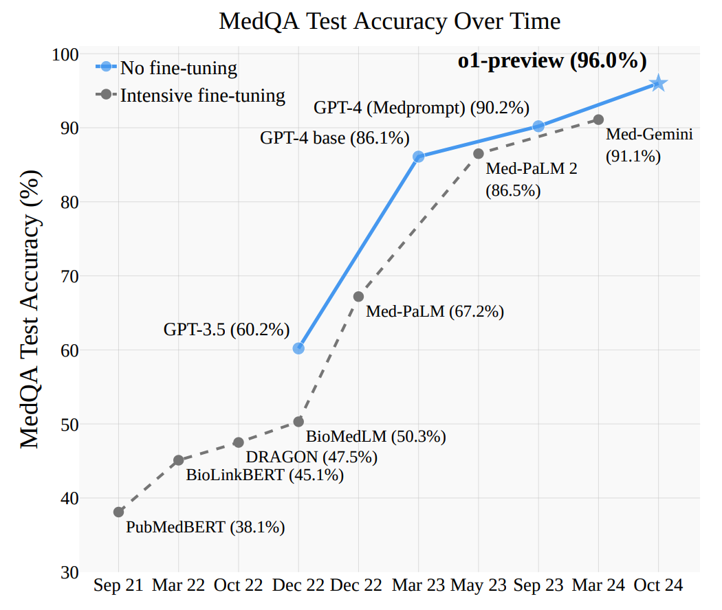 The o1-preview model sets new performance records on key medical benchmarks, surpassing prior approaches like Medprompt with GPT-4. On MedQA, o1-preview achieves top accuracy, outperforming Medprompt and five-shot GPT-4 baselines. Additionally, o1’s impressive results extend to JMLE-2024, a challenging Japanese medical competency exam. We analyze cost-benefit tradeoffs, exploring the Pareto frontier between accuracy and API compute costs, comparing o1-preview (Sep 2024), GPT-4o (Aug 2024), GPT-4 Turbo (Nov 2023) with various run-time steering strategies. We see potential for finer-grained control of runtime metareasoning strategies tailored to specific tasks, optimizing values and tradeoffs effectively.