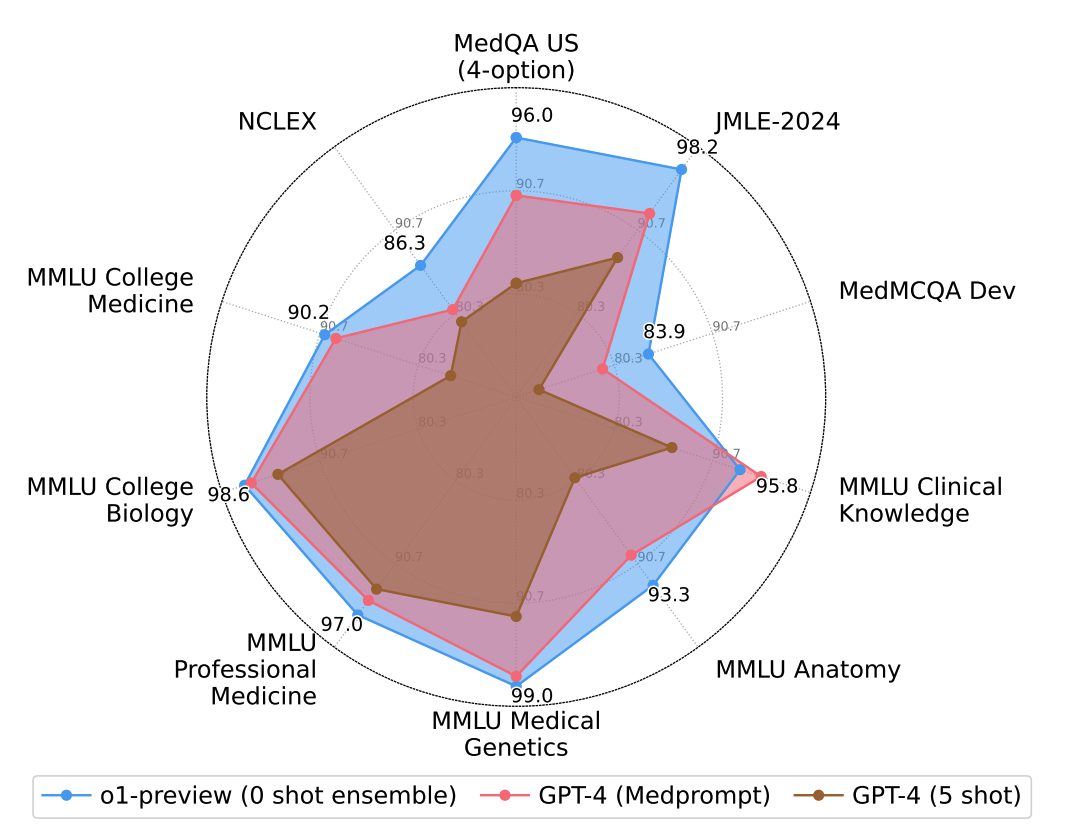 o1-preview outperforms GPT-4 with Medprompt in medical benchmarks without prompting, highlighting the shift towards reasoning-native models and the need for new challenging benchmarks.