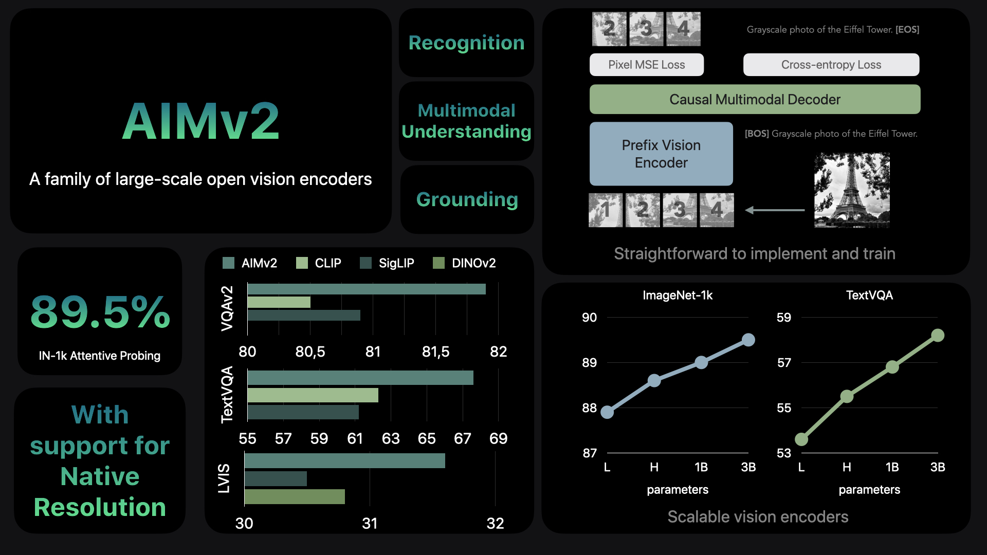 AIMV2, a multimodal vision encoder paired with an autoregressive decoder, achieves superior performance in vision benchmarks and multimodal image understanding tasks compared to contrastive models.