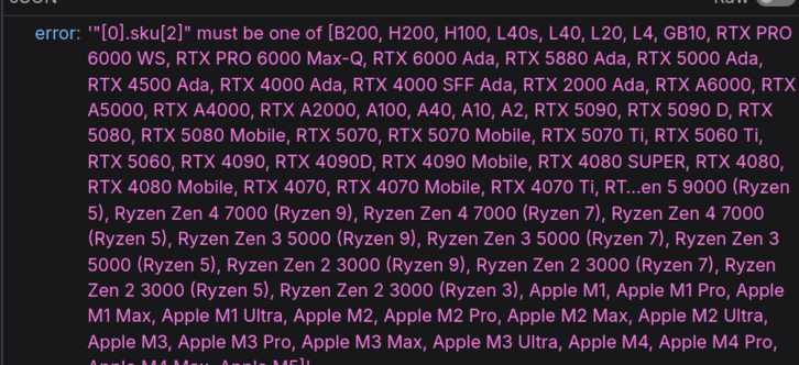 error '"[0].sku[2]" must be one of [B200, H200, H100, L40s, L40, L20, L4, GB10, RTX PRO 6000 WS, RTX PRO 6000 Max-Q, RTX 6000 Ada, RTX 5880 Ada, RTX 5000 Ada, RTX 4500 Ada, RTX 4000 Ada, RTX 4000 SFF Ada, RTX 2000 Ada, RTX A6000, RTX A5000, RTX A4000, RTX A2000, A100, A40, A10, A2, RTX 5090, RTX 5090 D, RTX 5080, RTX 5080 Mobile, RTX 5070, RTX 5070 Mobile, RTX 5070 Ti, RTX 5060 Ti, RTX 5060, RTX 4090, RTX 4090D, RTX 4090 Mobile, RTX 4080 SUPER, RTX 4080, RTX 4080 Mobile, RTX 4070, RTX 4070 Mobile, RTX 4070 Ti, RT…en 5 9000 (Ryzen 5), Ryzen Zen 4 7000 (Ryzen 9), Ryzen Zen 4 7000 (Ryzen 7), Ryzen Zen 4 7000 (Ryzen 5), Ryzen Zen 3 5000 (Ryzen 9), Ryzen Zen 3 5000 (Ryzen 7), Ryzen Zen 3 5000 (Ryzen 5), Ryzen Zen 2 3000 (Ryzen 9), Ryzen Zen 2 3000 (Ryzen 7), Ryzen Zen 2 3000 (Ryzen 5), Ryzen Zen 2 3000 (Ryzen 3), Apple M1, Apple M1 Pro, Apple M1 Max, Apple M1 Ultra, Apple M2, Apple M2 Pro, Apple M2 Max, Apple M2 Ultra, Apple M3, Apple M3 Pro, Apple M3 Max, Apple M3 Ultra, Apple M4, Apple M4 Pro, Apple M4 Max, Apple M5]'