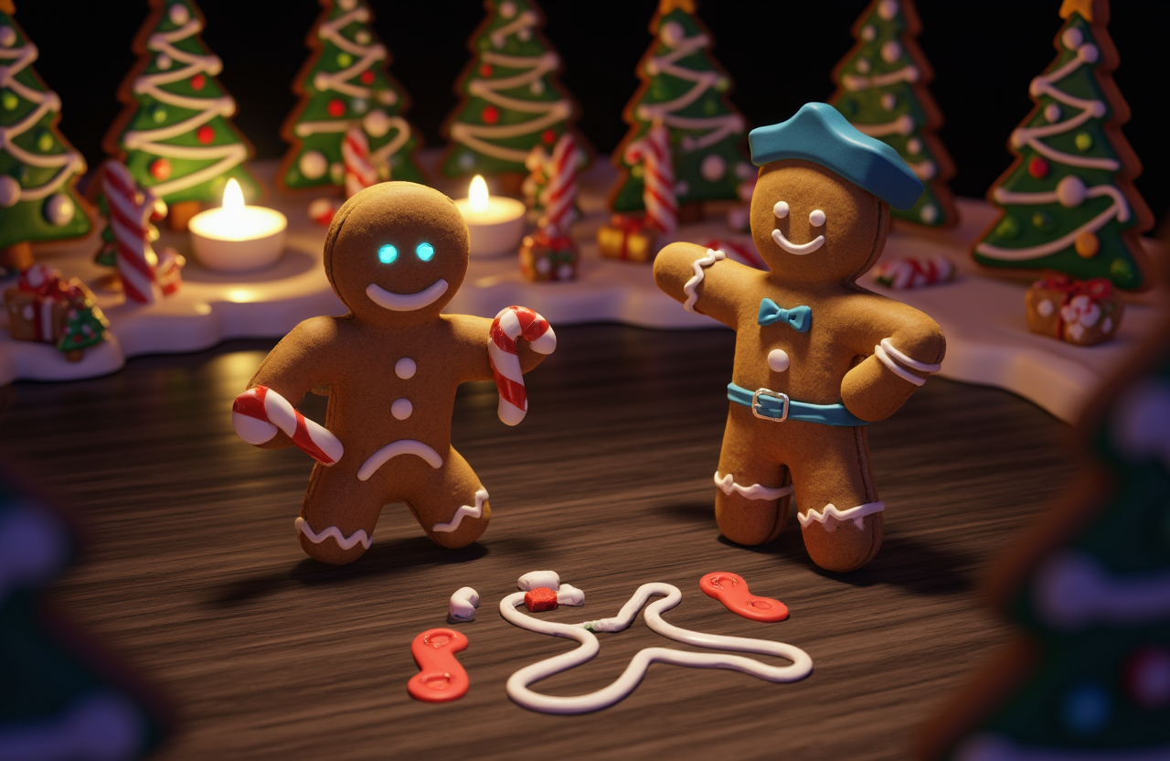 Xmas 3D, two gingerbread men are standing on a dark wooden table. The gingerbread man on the right is wearing a blue belt, a blue hat, and a blue ribbon around his waist. His eyes are glowing blue. His hands are raised in front of him, and his mouth is slightly open. He is holding a candy cane in his left hand. The candy cane is in the shape of a heart, with a white rope wrapped around it. In front of the ginger bread man, there is a white candy cane with a red number 2 on it. There are two red candy barks on the table, adding a pop of color to the scene. In the background, a row of gingerbread trees are adorned with green and white lights.