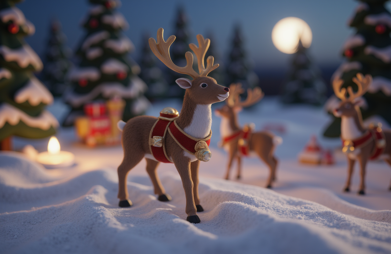Xmas 3D, A detailed shot of a reindeer figurine standing on a snowy hill. The reindeer has golden antlers and is adorned with a red velvet harness decorated with silver bells. Around its hooves, there are tiny snowdrift details. In the background, you can see blurred silhouettes of more reindeer and pine trees lit by a soft moonlight glow.
